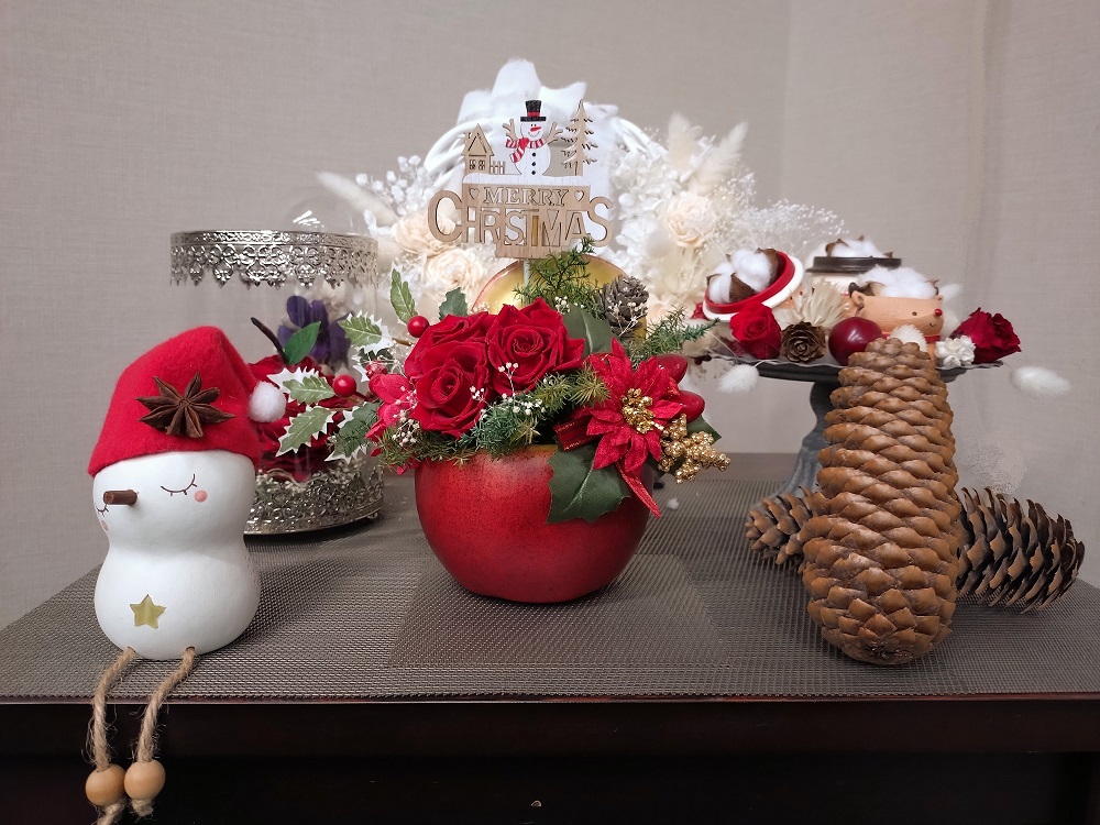 事務所では、社長の奥様が作られたかわいいクリスマスアレンジたちが